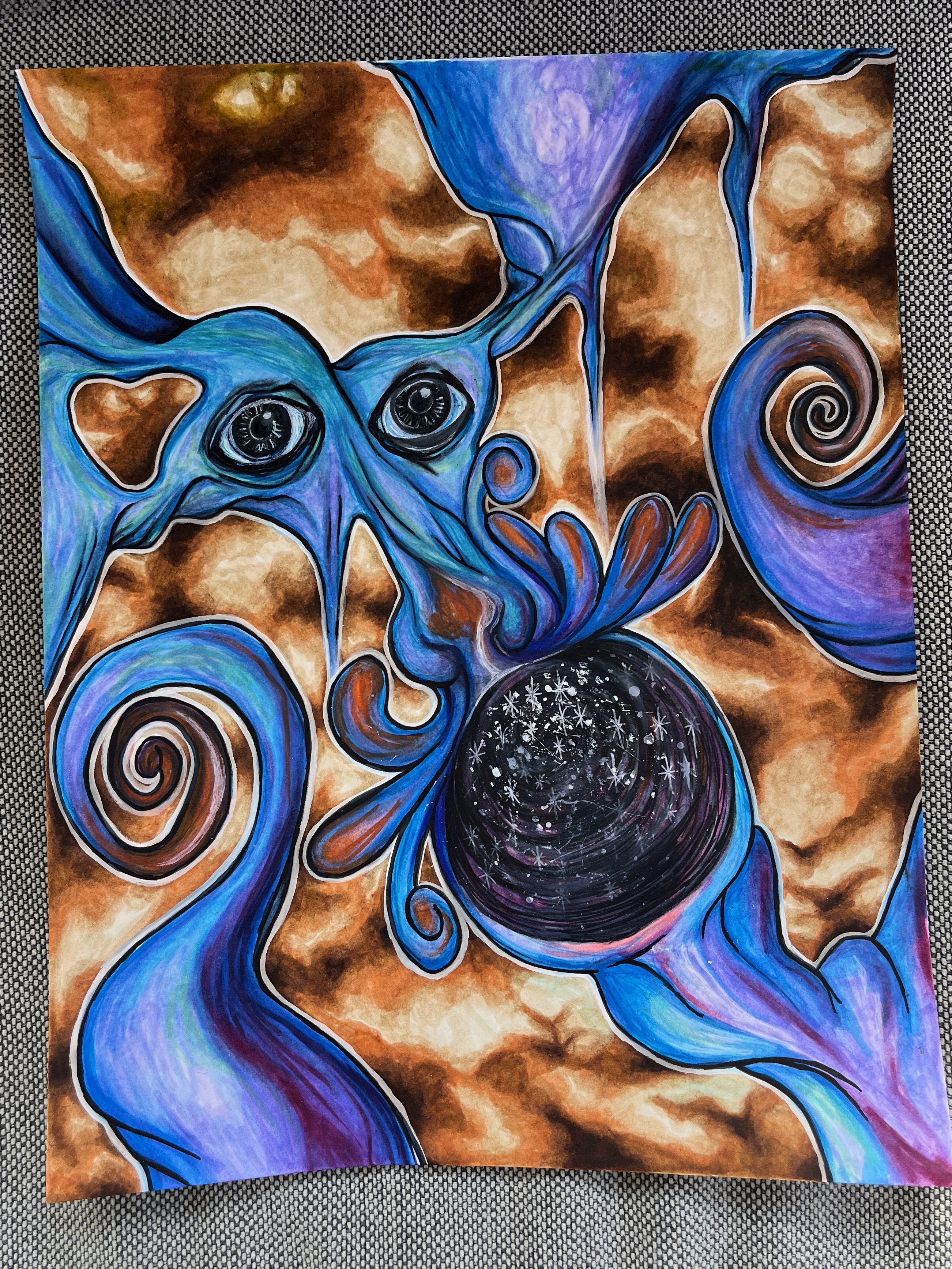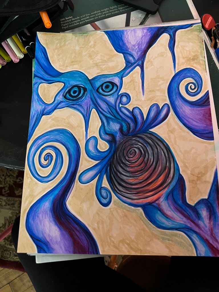 it’s become clear to me that silliness and playfulness help me actually draw, while seriousness and concern for profundity only help me criticize myself until all creativity comes to a halt. swirls of color and smears of ink are messages carried from something outside of me, brought inside of me and channeled out again. maybe my art will be profound on accident and maybe it wont. it matters more that i made it.